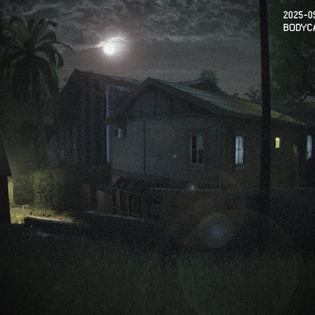 ![]() | ボディカメラの画像 住宅の最上部から撮影した警察官のボディカメラの切り抜き画像。裏庭が部分的に写っている。 |