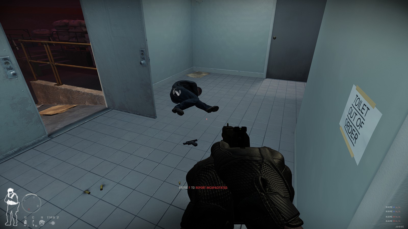 全員無力化した時点でこの項目は完了となるが、致死性武器によりダウンさせた場合でも死んだふりをしている者がいると制圧判定とならないため、射殺した場合でもしっかりと縛ったほうが良い。