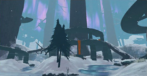 雪に覆われ、数本の大木がそびえ立つ盆地。凍りついた川が中央を通っている。凍った川の上は滑りやすい。