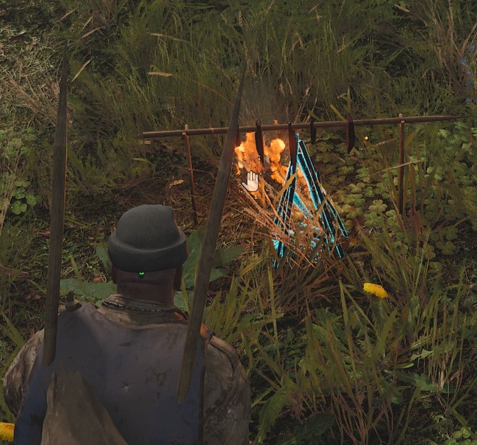 注意点として、焚き火はクラフトした場所にそのまま設置されるので、設置場所を選びたい場合はWooden Stickを複数選択して右クリックのメニューから"Craft Bundle of Wooden Stick"を選択、できた枝の束をHands欄に装備して好きな場所まで持っていくといい - 焚き火が設置できたら、インベントリ画面で焚き火と着火用アイテムを選択し、右クリックのメニューから"Light Fire"を選択する