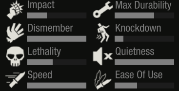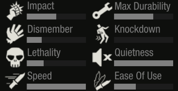 | 2.5 | 9 | 雑木林をキレイにするのに役立つ装備。この質素な鉈はゾンビの四肢を切り飛ばすのに驚くほど効果的だ。 |