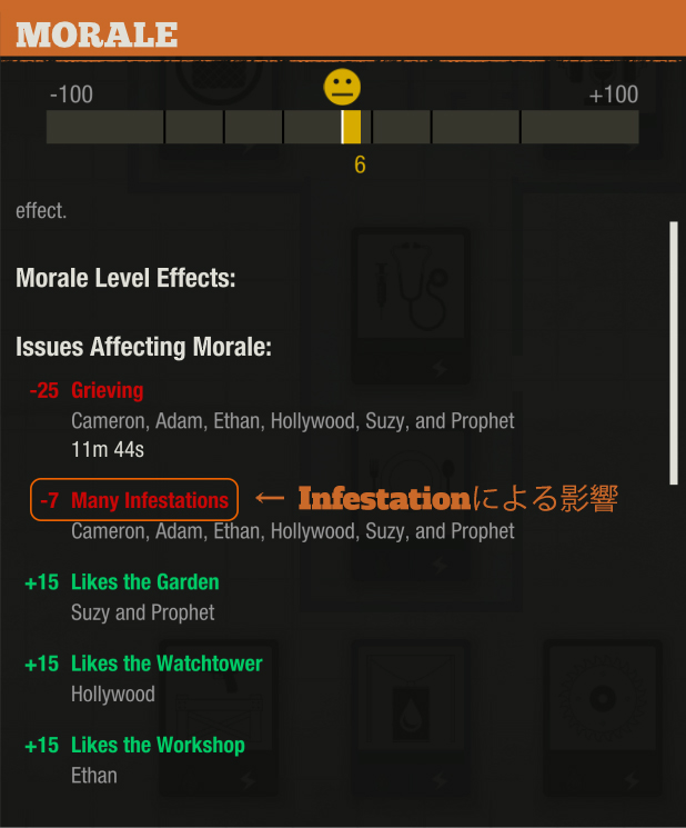 マップ上に存在するInfestationの数が増加していくと、コミュニティのモラルが低下していく