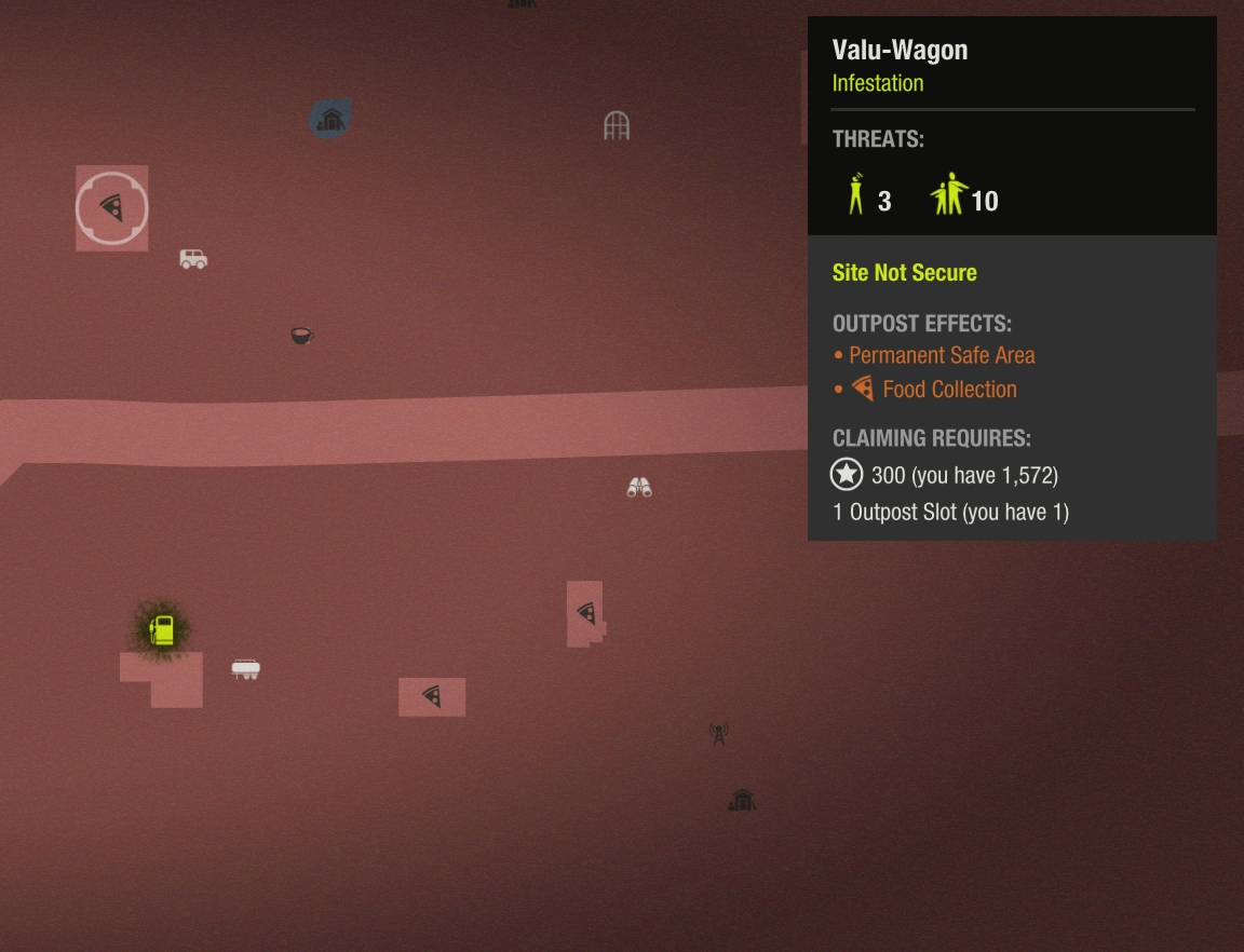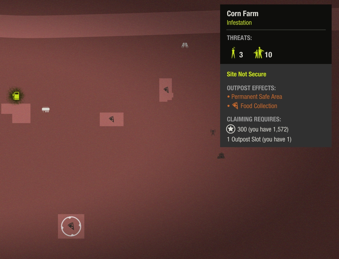 Infestationが発生している建物は画像のように黄緑色のアイコンでマップに表示され、Threats欄に表示されている数のScreamerとその他のゾンビたちを全て倒せば解消される