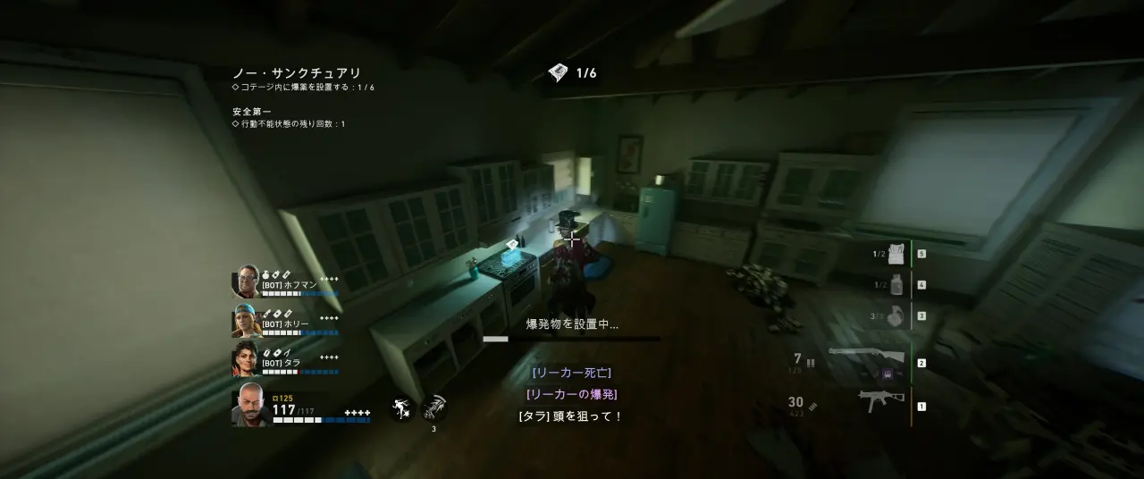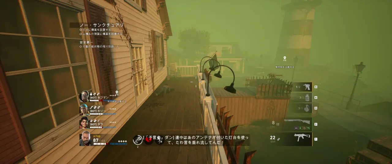 また、難易度ノーホープでは爆弾を設置する順番で後の戦いやすさが変わってくるため、リゾートの出口の脇 (鐘のある高台のところ) にあるコテージは最後に設置するのがオススメ。