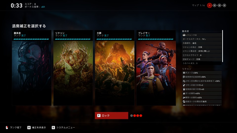 マッチ開始時、プレイヤー全員でゲームの難易度に影響する様々な補正を増減させることができる。補正は難易度、リドゥン、大群、プレイヤーの4項目に分かれ、それぞれ最大15段階までランクを上げることができる。各補正のランクが高いほど、最終的なスコアにかかる倍率が高くなる。
