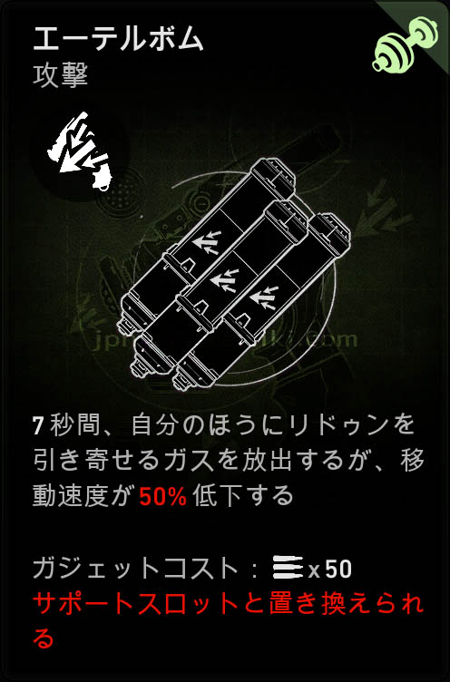 - 7秒間、自分の方にリドゥンを引き寄せるガスを放出するが、移動速度が50%低下する