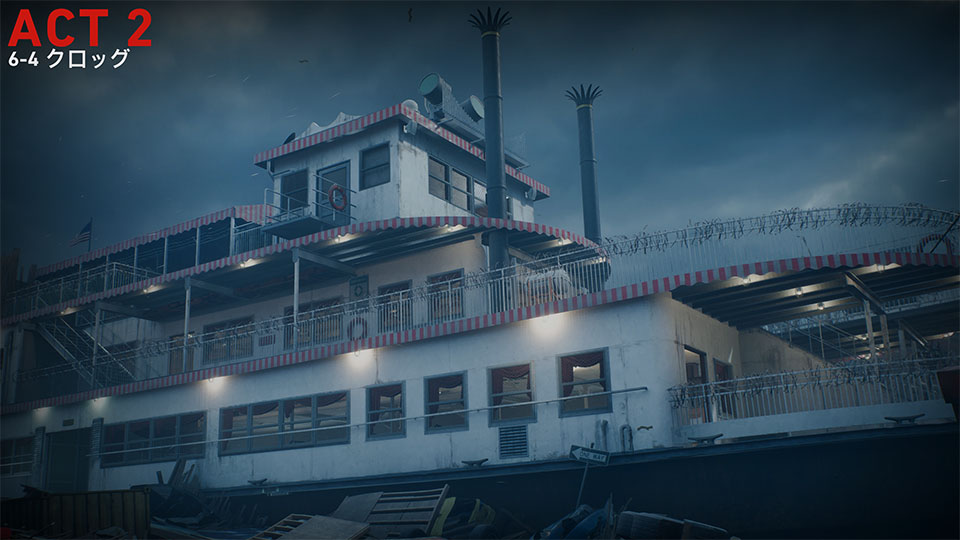 客船内に入ったら階段を使って上の階へと向かう。客船の入り口や船内のドアはアラーム付きになっている場合もあるので注意。道中には様々なアイテムが配置されるため探索しながら進んだほうがいいが、基本的に狭いエリアのため、トールボーイ系の変異体の出現には警戒しておく必要がある。最上階まで上ると最奥にセーフルームが見える。