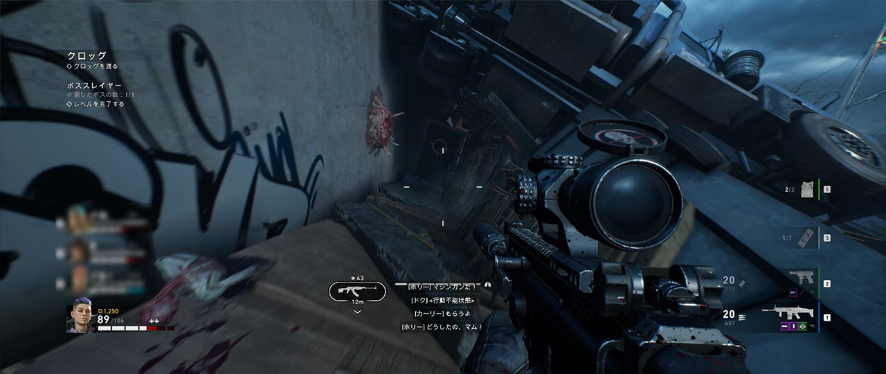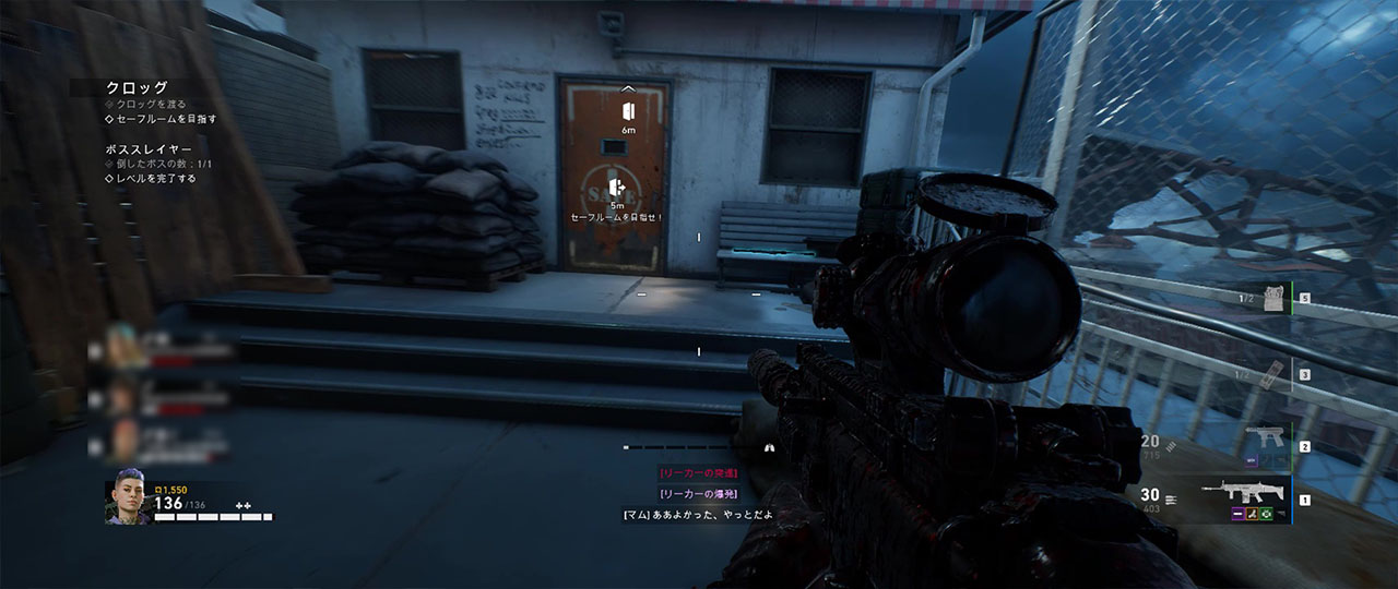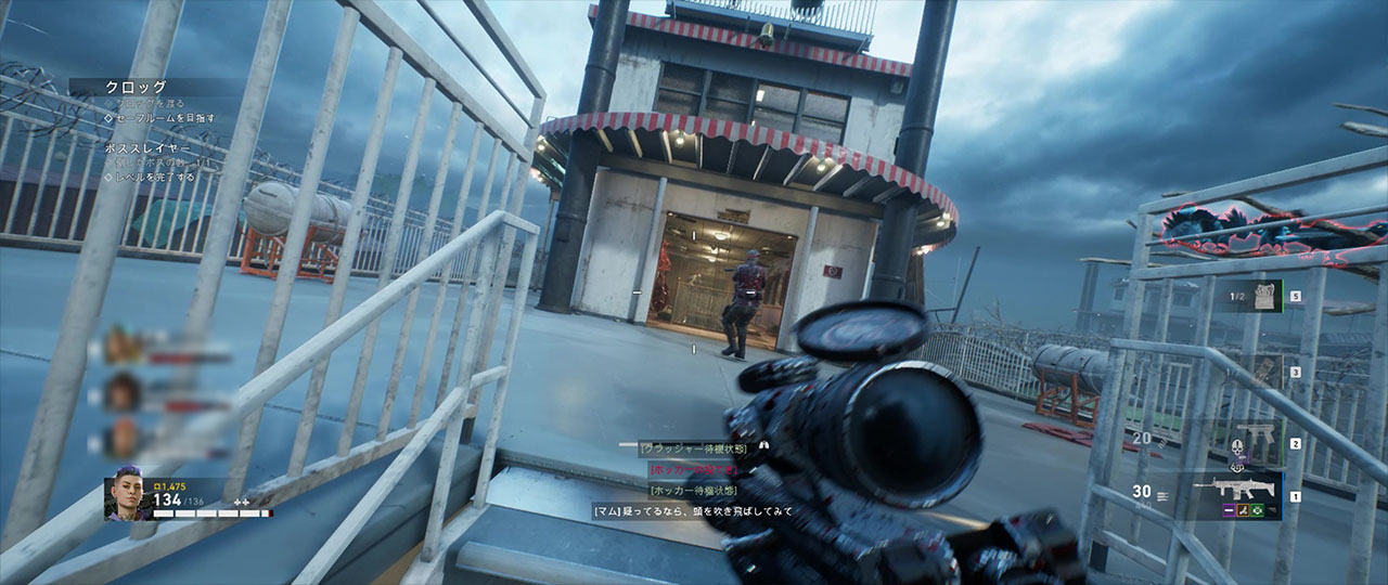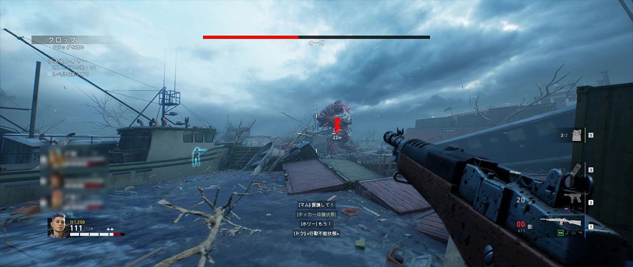 セーフルームを出て塀を下りると、無数のコンテナやボートが沈んで足場となっているエリアが見える。このレベルのほとんどはこれらの海に浮かんだものの上を移動するため、落下死の危険が常に付きまとう。強いノックバックを発生させるエクスプローダーのほか、ホッカーの拘束もヒット時に大きく後ろに飛ばされるため、待機音が聞こえたら早めに発見できるよう周囲を警戒しておこう。