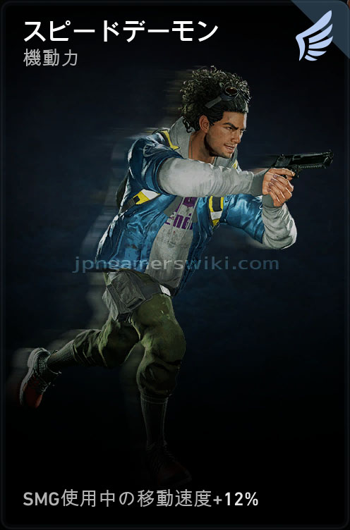 サブマシンガン使用時という条件こそあるものの、特にデメリットもなしに移動速度+12%という上昇幅は破格と言える。SMGを持つと遠距離への対応力が心もとなくなるのが難点だが、