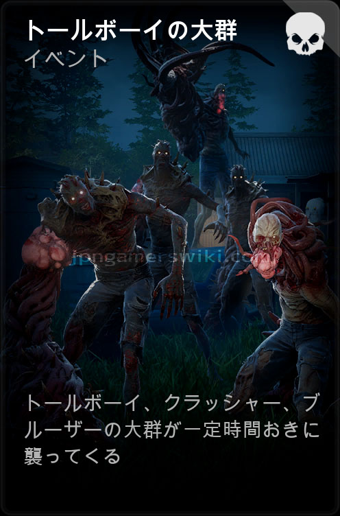 狩られるもののトールボーイ系限定版。左上に表示されたタイマーが切れるとトールボーイ、ブルーザー、クラッシャーの3種が同時に複数体出現する。トールボーイ系は非常に高い体力を持つため、Act序盤にこのカードが選択された場合、火力や物資が足りず厳しい戦いを強いられることになる。爆発ダメージやアクセサリダメージを強化しておくと多少対処しやすくなるが、基本的にはレベルをなるべく早くクリアして消耗を抑える必要がある。