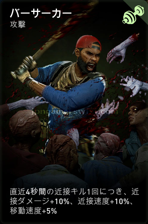 - 近接キル1回につき、近接ダメージ+5%、近接速度+5%、移動速度+5% (3秒間)