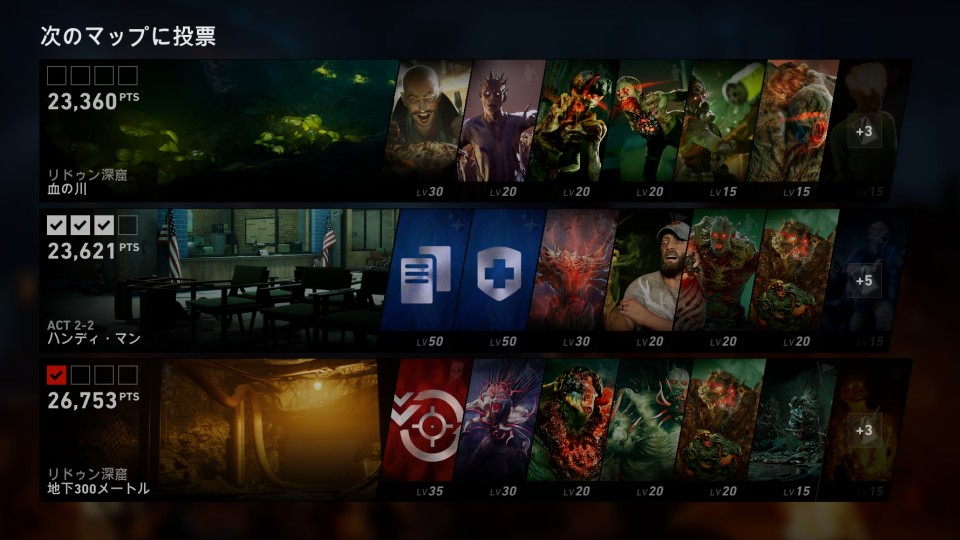 退廃補正を決定したら、次は一部を除くキャンペーンの全レベルと苗床以外のリドゥン深窟からランダムに選ばれた3つのマップの内どれをプレイするかを投票で決める。マップの投票は1つマップをクリアするごとに毎回行われ、最も投票数の多かったマップをプレイすることになる。