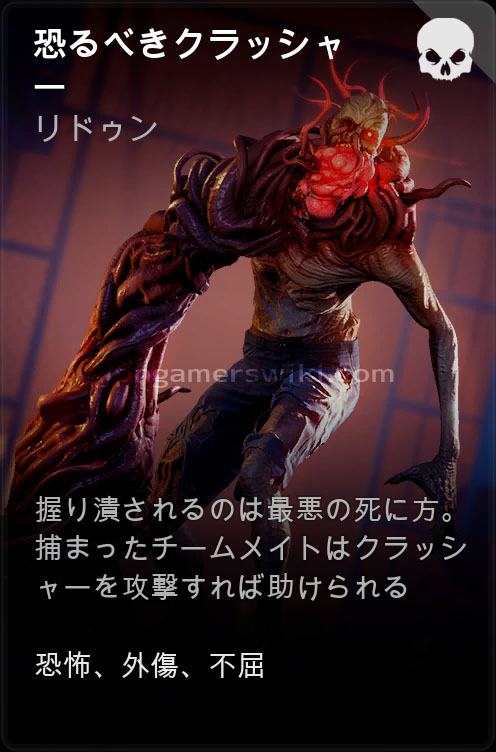 凶暴なクラッシャーの能力に加え、拘束中はよろめき効果が効かなくなり、救出がより困難になる。フラッシュバンやスタンガンは効くため、持っている場合は外傷が蓄積する前に早めに使用するといい。