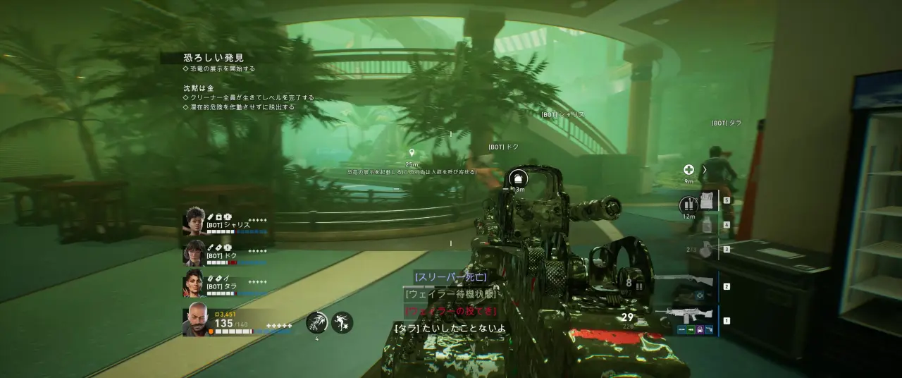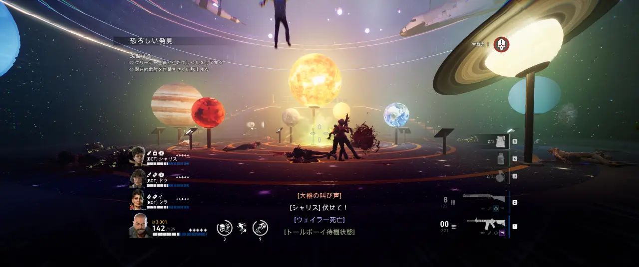 プラネタリウム内に降りたらスイッチを押して展示を動かす。展示を開始すると大群が発生するため、降りてきた場所の下にこもって戦うといい。ここなら見通しがよく、後ほど出現するスナイパーにも対応しやすい。また、ここには火炎放射器の入ったクレートがあるため、ツールキットを使って開ければ変異体を倒しやすくなる。