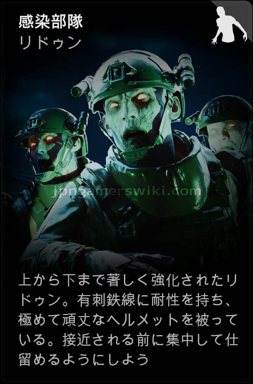 上から下まで著しく強化されたリドゥン。有刺鉄線に耐性を持ち、極めて頑丈なヘルメットを被っている。接近される前に集中して仕留めるようにしよう