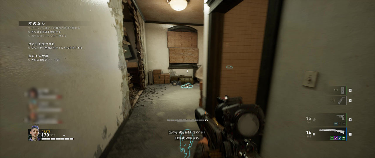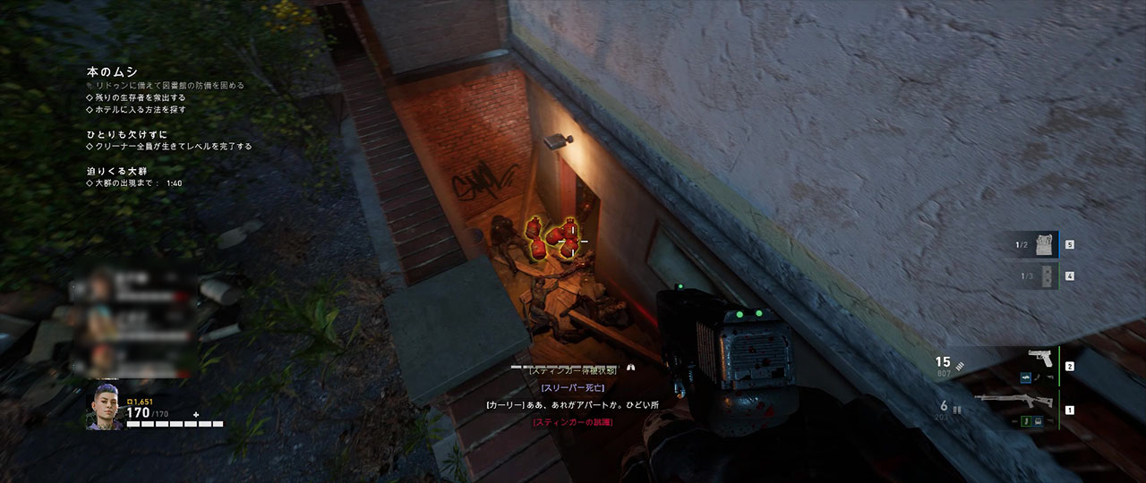 生存者のいるアパートに着いたら侵入口を探すことになるが、地下の入り口にあるプロパンを撃てば中にはいれるようになる。