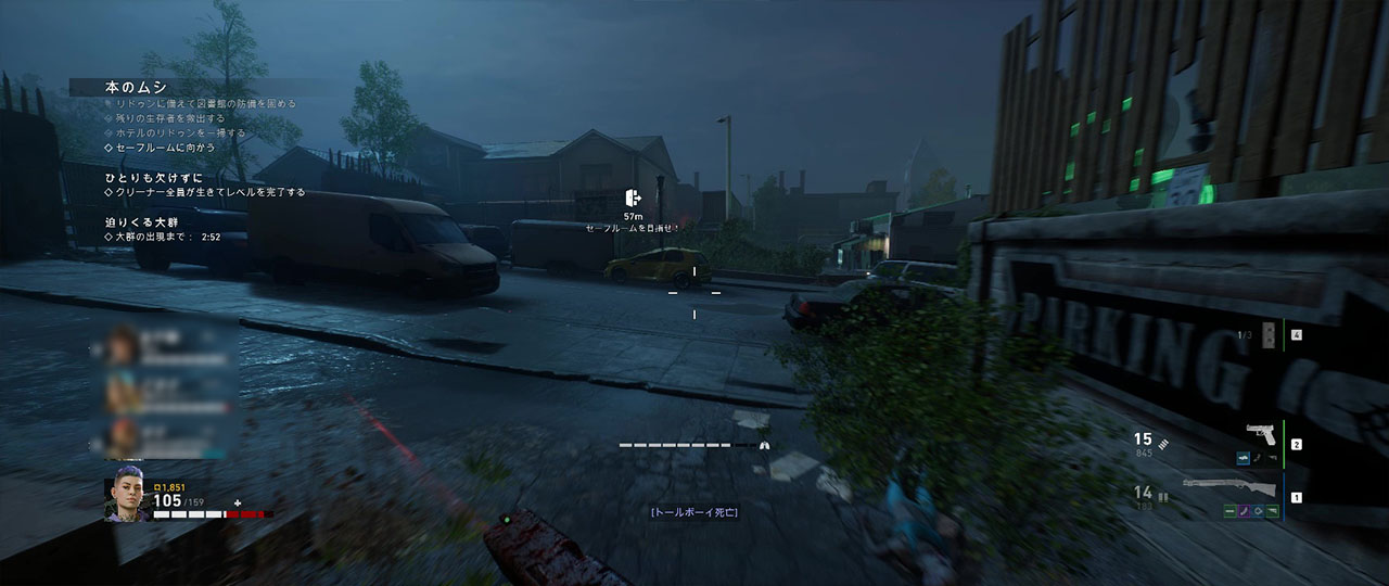 生存者を救助し終えたら外階段を使って下に降り、セーフルームへと向かう。セーフルームはアパートの路地を抜けた正面にあり、ドアの手間に配置された車をよじ登れば到達できる。