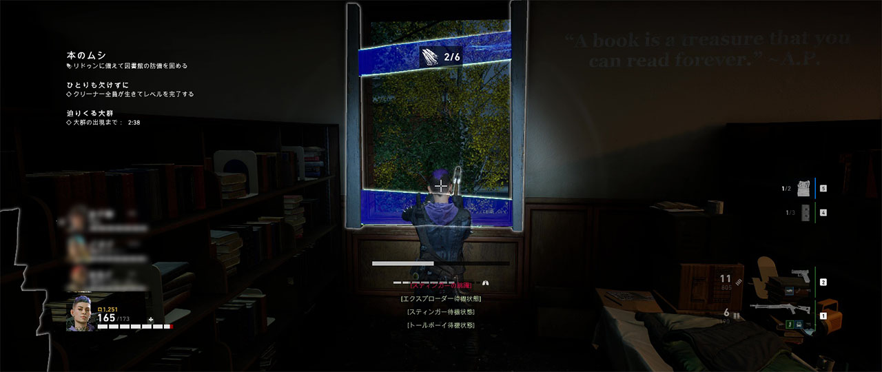 まずは図書館内の開いた窓を全て塞ぐ。開いた窓の直ぐ側には強化板配置されているので、これを窓まで運んで打ち付ける。1枚の窓につき3枚の板が必要になり、その都度長押しのインタラクトがあるため、使用速度を上げておくとスムーズに進めることができる。
