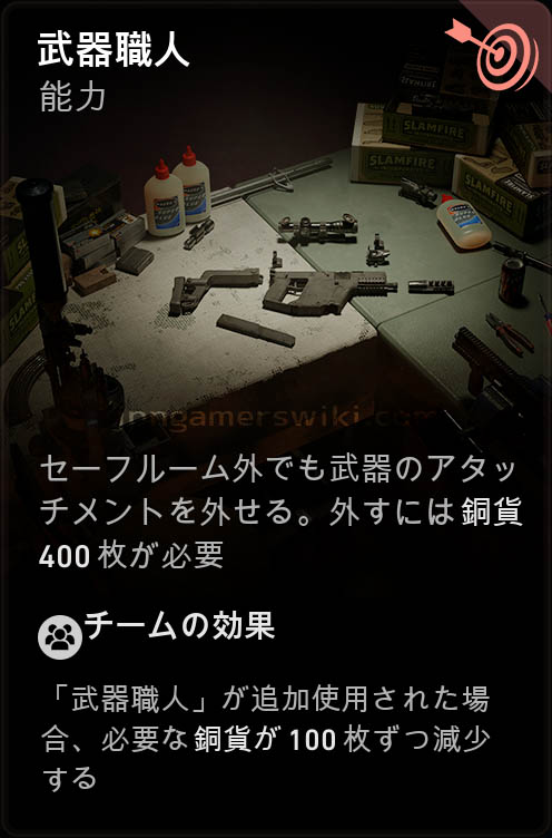 - セーフルーム外でも武器のアタッチメントを外せる。外すには銅貨400枚が必要