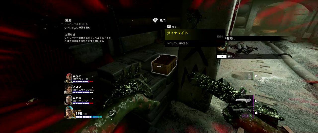 セーフルームから出て下に降りたら、トロッコに積む爆薬を3つ (オフラインでは1つ) 探す。爆薬を見つけたらトロッコまで持ち帰って積み込む。すべての爆薬が積み終わったら、トロッコをインタラクトしてエンジンを起動する。