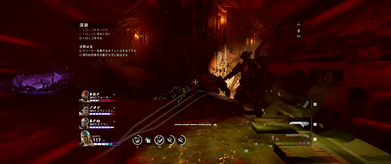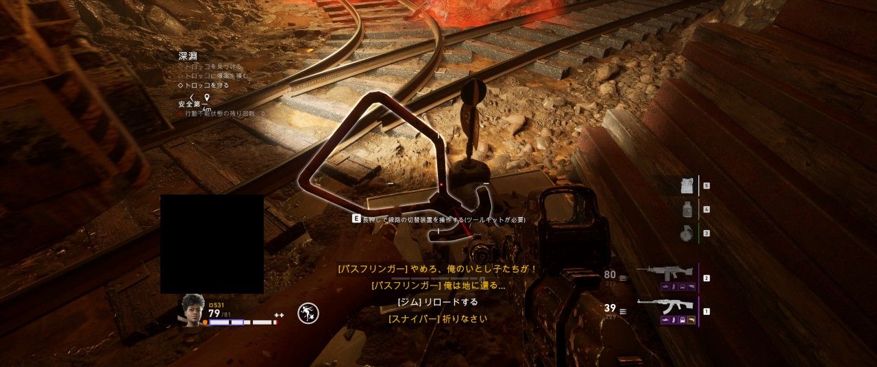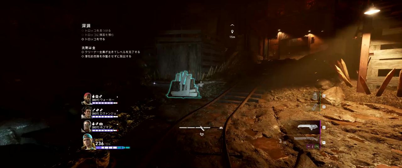 トロッコを爆破したら崩落していた地点が通れるようになり、その先にセーフルームがある。ただし、トロッコを爆破した時点で大群が発生するため、敵に囲まれないよう一旦隅に集まって敵を迎え撃つか、あるいは急いでセーフルームまで走り抜けるといい。