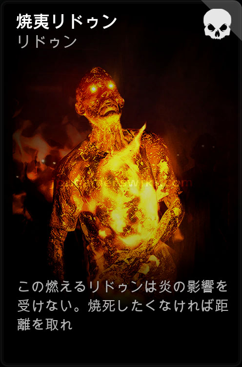 この燃えるリドゥンは炎の影響を受けない。焼死したくなければ距離を取れ