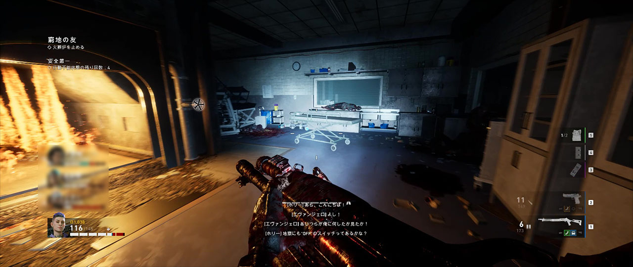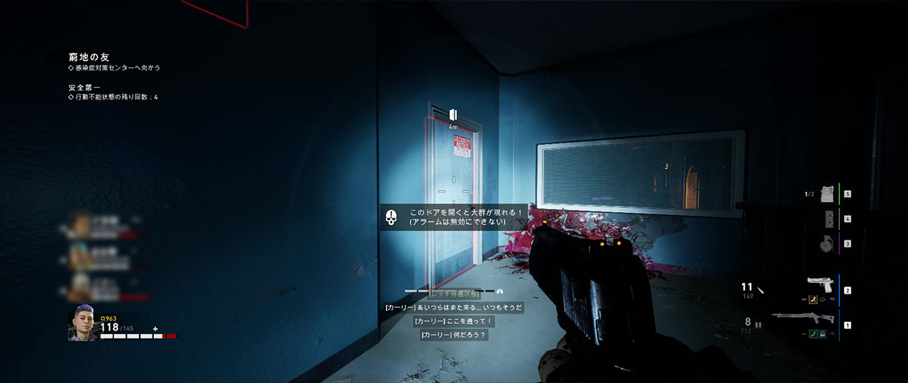 火葬場からあがったら屋内を適度に探索して葬儀場を出る。葬儀場内はいくつか部屋があるが、ドアがアラーム付きになっていることも多い。一応医療キャビネットが配置されていることもあるので、開けれるところは見て回っておくといい。なお、葬儀場の出口もアラーム付きになっている場合があるが、これは外の敵をおびき寄せて壊してもらえば警報を鳴らさずに済む。