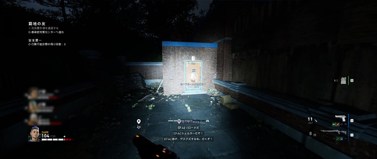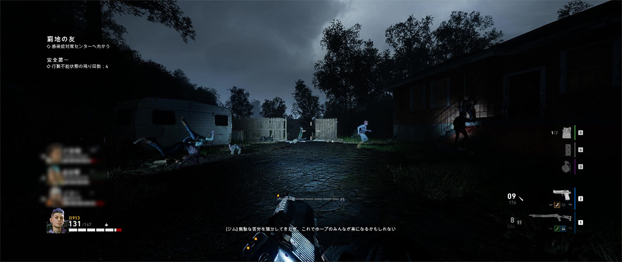 葬儀場を出たら通りを渡って2つ並んだ家を抜け、奥にある学校へと向かう。葬儀場正面の青い家はトレジャードアが配置されるため、ツールキットがあれば開けて物資を補給しておこう。隣りにある家は中には入れないが、周りにいくつかアイテムが置いてあることもある。また、2つの家の間にある梯子のついた小屋の中には医療キャビネットが配置されることがある。