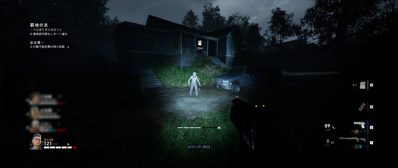 セーフルームを出たら噴水を越えて進み、正面に見える家の前を左手に曲がる。戦地の奥へでは右手の木立を進んだが、今回そちらへは行かない。家の脇にある小屋にはアイテムが配置されるため通りすがらに見ておくといいが、付近の壁にスリーパーがいることもあるので注意。