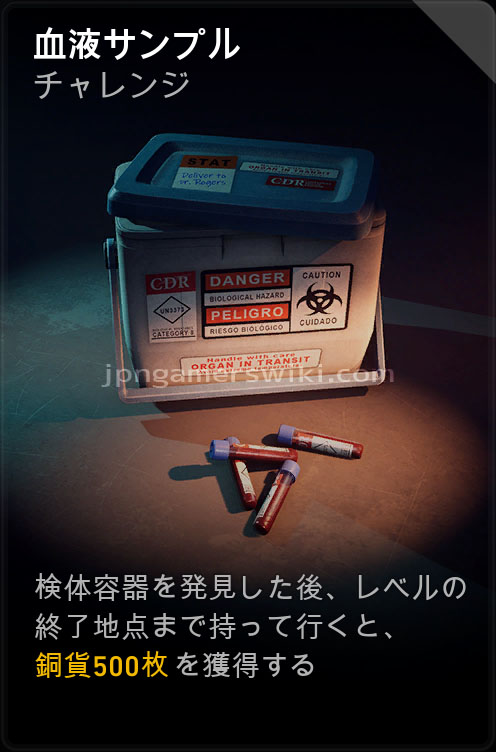 | 血液サンプル - サバイバル Blood Samples - Survival | チャレンジ | 検体容器を発見した後、クリーナー4人全員が生きた状態でレベルの終了地点まで持っていくと報酬獲得: 銅貨500枚 物資ポイント+10 |