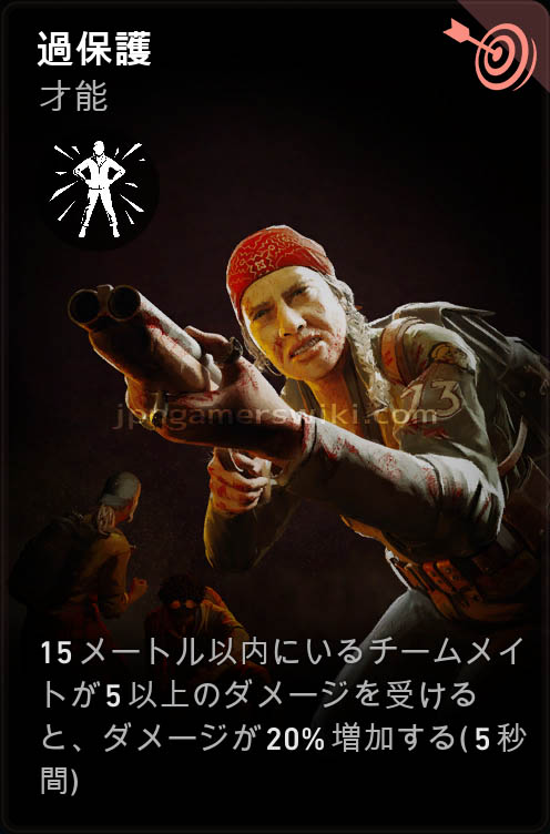 - 15メートル以内にいるチームメイトが5以上のダメージを受けると、ダメージが20%増加する (5秒間)