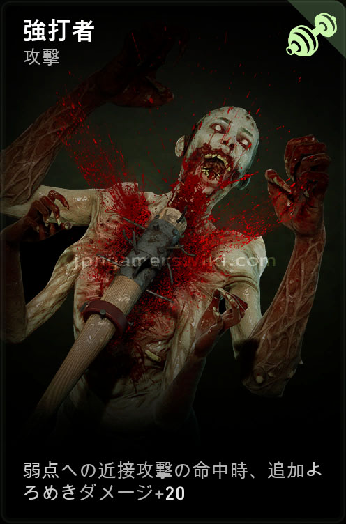ダメージの低いバットマチェーテでも大きなよろめき効果を与えられるようになり、変異体に対して怯みを取りやすくなる。ただし弱点を攻撃する必要があるため、退廃カードアーマード系の敵が出現している場合は先にアーマーを破壊しなければ効果を活かせない。