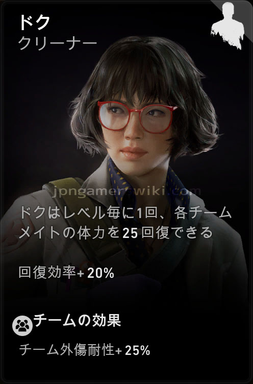 回復など体力の管理に特化したサポート役。回復効率にボーナスがあるため、積極的に他のチームメイトを回復するのに向いている。回復アイテムがなくても1人1回ずつまでならアイテム無しで回復を行うことができるため、チームメイトのアイテムや体力を見て、必要なら回復してあげるといい。また、厄介な外傷に対する耐性をチーム全体に付与するため、特に高難易度においては重宝される。