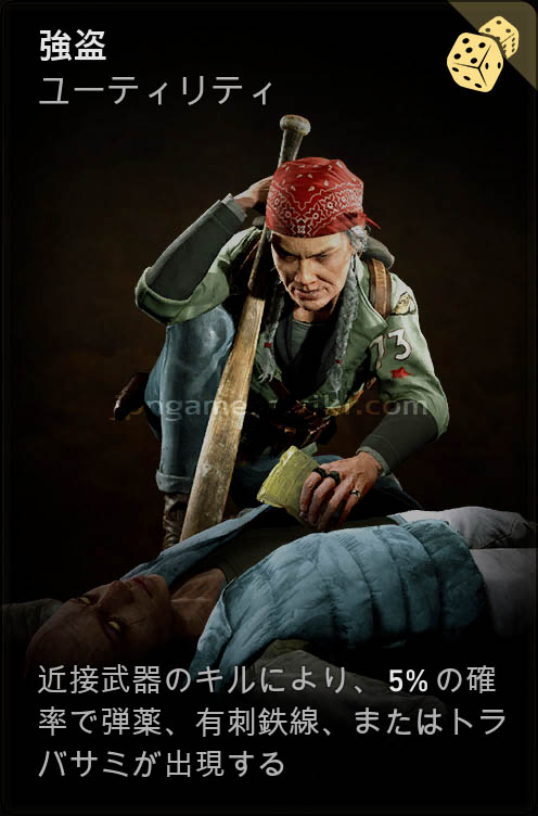 - 近接武器のキルにより5%の確率で弾薬、有刺鉄線、またはトラバサミが出現する