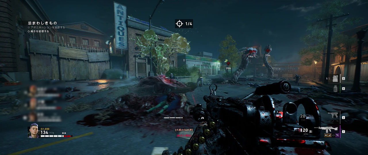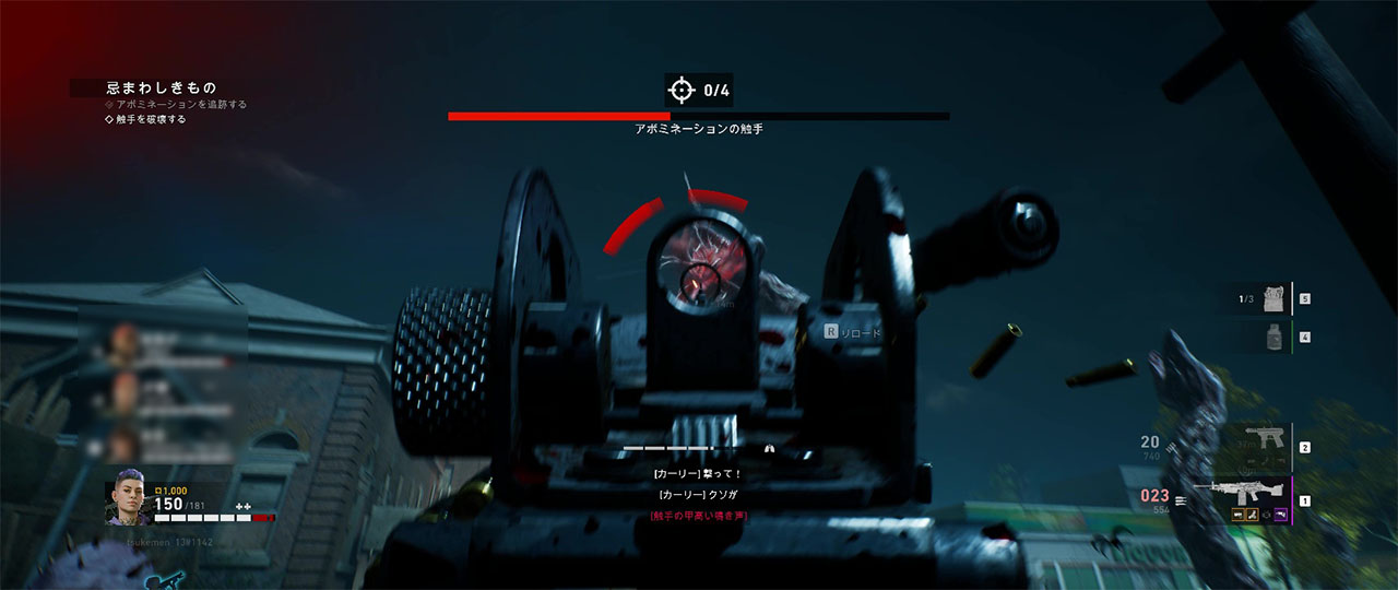 通りに下りると地面からアボミネーションの触手4本が出現するので、まずはこれを倒す。触手は先端が開いた時のみダメージを与えることができ、さらにここが弱点扱いになっているため、弱点ダメージを上げておくと倒しやすい。ただ、触手は先端を開いた後に向いている方向の地面を素早く叩きつけてくるので、攻撃する際はこれに巻き込まれないよう注意しておこう。
