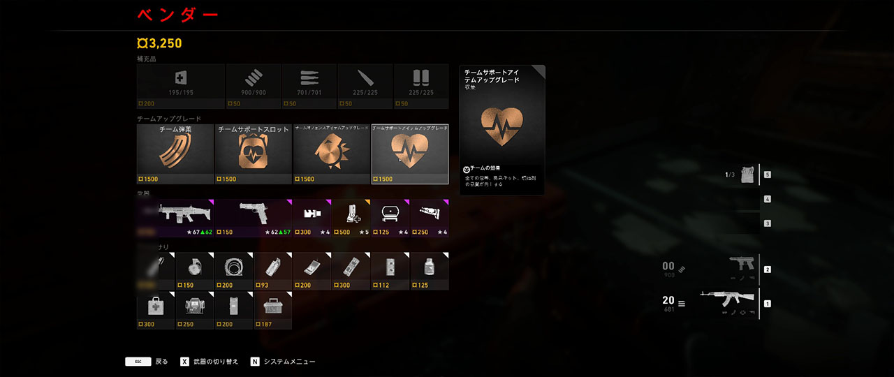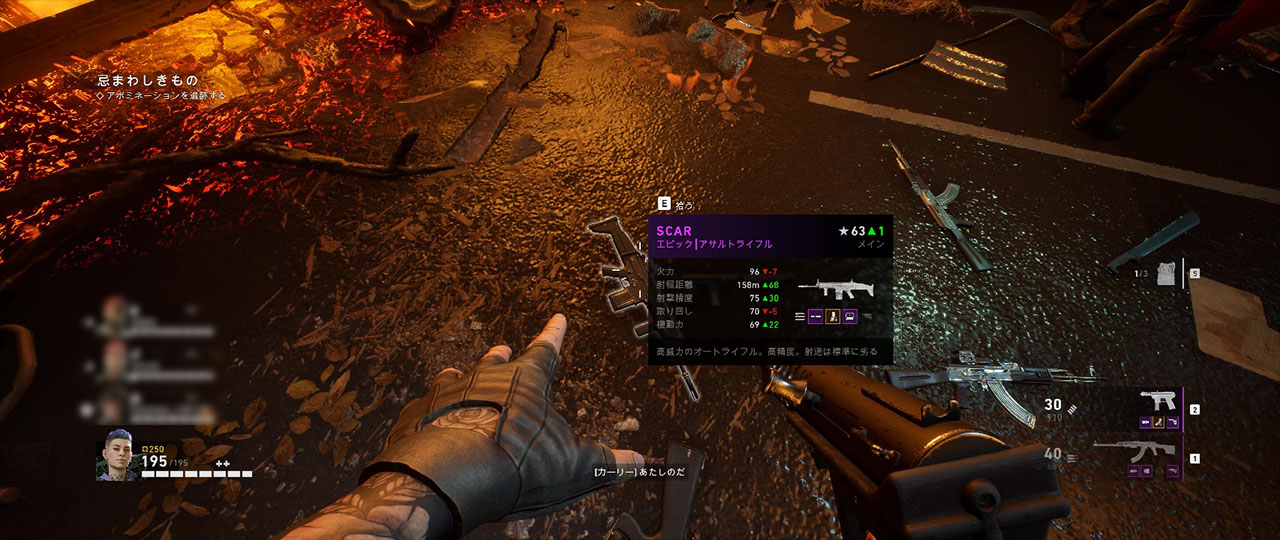 レベルを開始すると周囲にエピックの武器が落ちているので、自分のデッキ構成にあった武器をここで選択しておく。もしもビルドに合う武器がなかった場合、ベンダーで購入できる可能性があるので確認しておくといい。武器に関しては射程のある武器種のほうが戦いやすいため、AR、SR、LMG辺りが有用。潜行やクイックキルを利用してSGをメイン武器にしても良い。潜行のしゃがみを利用して大群相手は立ち状態、弱点はしゃがみ状態という風に使い分けよう。弾薬はマップにケースがいくつか配置されているため、多少武器種が被っても問題ない。また、戦闘エリア内にはいくつか武器が落ちており、必要に応じてそれらと持ち替えるということもできる。