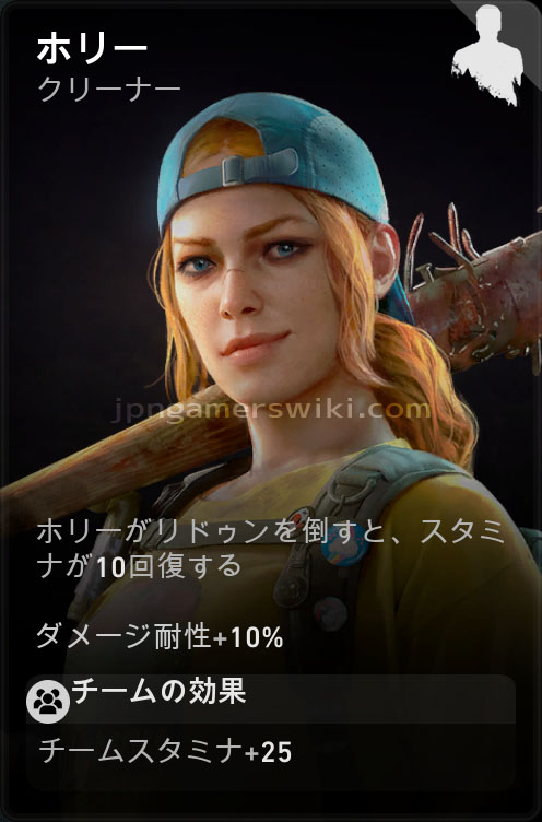 スタミナに関してはダッシュや殴打にも使うため、近接武器を主体とするビルド以外でも恩恵はあるのだが、ホリー以外だと近接特化のデッキを活かしづらいという事情もあるため、近接武器を使わないなら他のクリーナーを選択したほうが無難。