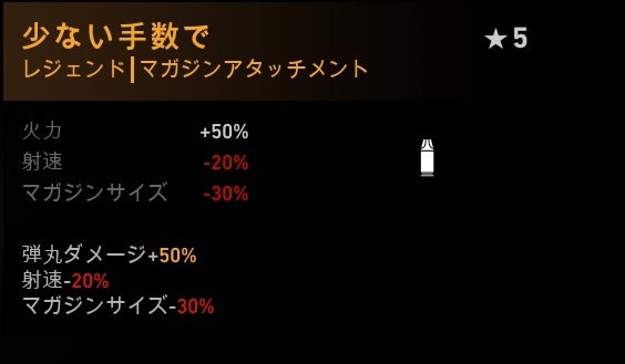 弾丸ダメージを1.5倍にする代わりに連射速度とマガジンサイズを犠牲にするピーキーなアタッチメント。