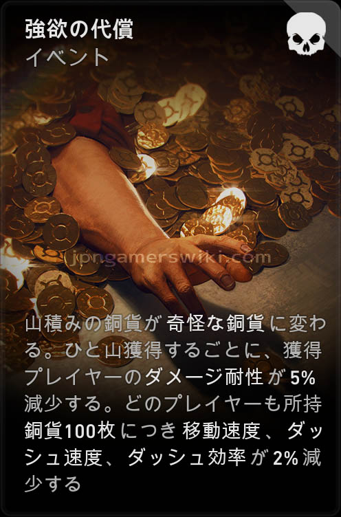 山積みの銅貨が奇怪な銅貨に変わる。ひと山獲得するごとに、獲得プレイヤーのダメージ耐性が5%減少する。どのプレイヤーも所持銅貨100枚につき移動速度、ダッシュ速度、ダッシュ効率が2%低下する