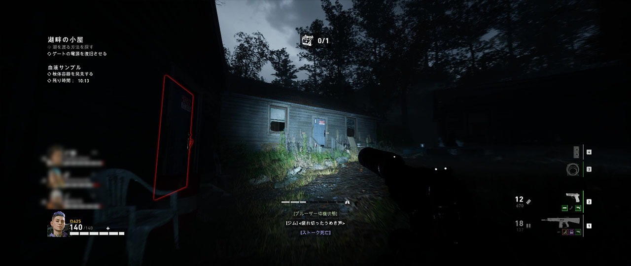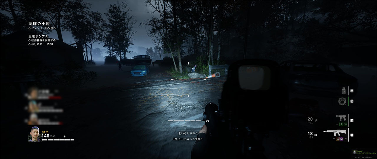 キャビンのエリアを抜けた後はしばらく森の中を歩くことになる。視界が悪く、発砲音に反応した敵が茂みの中から出てくることも多いので、注意して進もう。途中にあるキャンプ跡にはアイテムが配置されることがあるが、鳥が中心にいることもある。