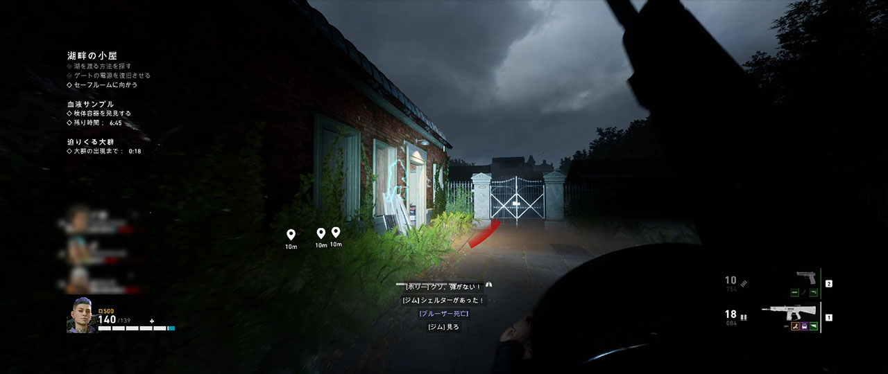 ゲートを開けたら正面の橋を渡り、坂を登った先にあるセーフルームを目指す。この時退廃カード「時限リーカーの大群」が自動で追加され、橋の向こう側からリーカー、エクスプローダー、レッチが一気に出現する。この橋の途中で立ち止まってしまうとこれらの変異体による攻撃を避けにくく、さらに橋の上でエクスプローダーが爆発すると足場が骨組みだけになってしまい、最悪下に落ちて敵に囲まれることになる。そのためここは正面から現れるリーカー系の敵を無視して一気に橋を渡りきってしまったほうが安全。そのまま正面の坂を上るとセーフルームがあるため、スタミナがあればここまで駆け抜けてしまいたい。ただしセーフルームのある建物の壁にはスリーパーがいることも多いので、建物の正面に出る前に一旦確認しておくのを忘れずに。