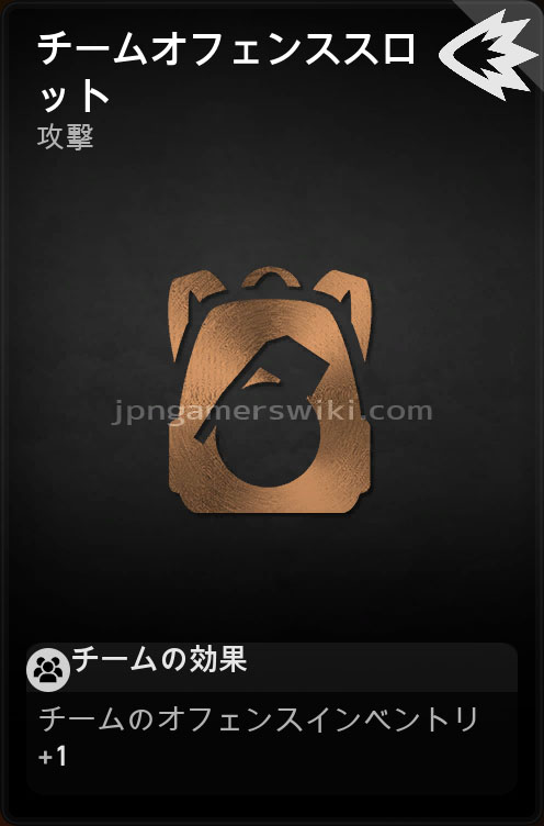 ![]() | チームオフェンススロット Tteam Offense Slot | 攻撃 | チームのオフェンスインベントリ+1 |