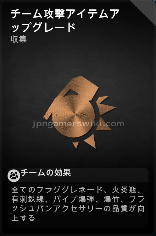 ![]() | チーム攻撃アイテムアップグレード Team Offensive Item Upgrade | 収集 | すべてのフラググレネード、火炎瓶、アラーム爆弾、爆竹、フラッシュバン、餌入り瓶、スモークグレネードの品質が向上する |