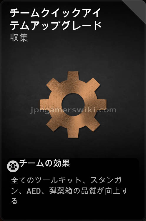 ![]() | チームクイックアイテムアップグレード Team Quick Item Upgrade | 収集 | すべてのツールキット、スタンガン、AED、弾薬箱、有刺鉄線の品質が向上する |