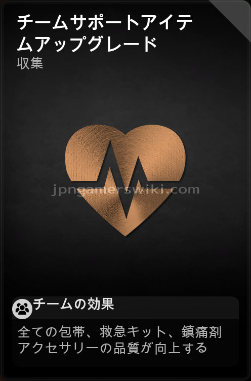 ![]() | チームサポートアイテムアップグレード Team Support Item Upgrade | 収集 | すべての包帯、救急キット、鎮痛剤の品質が向上する |