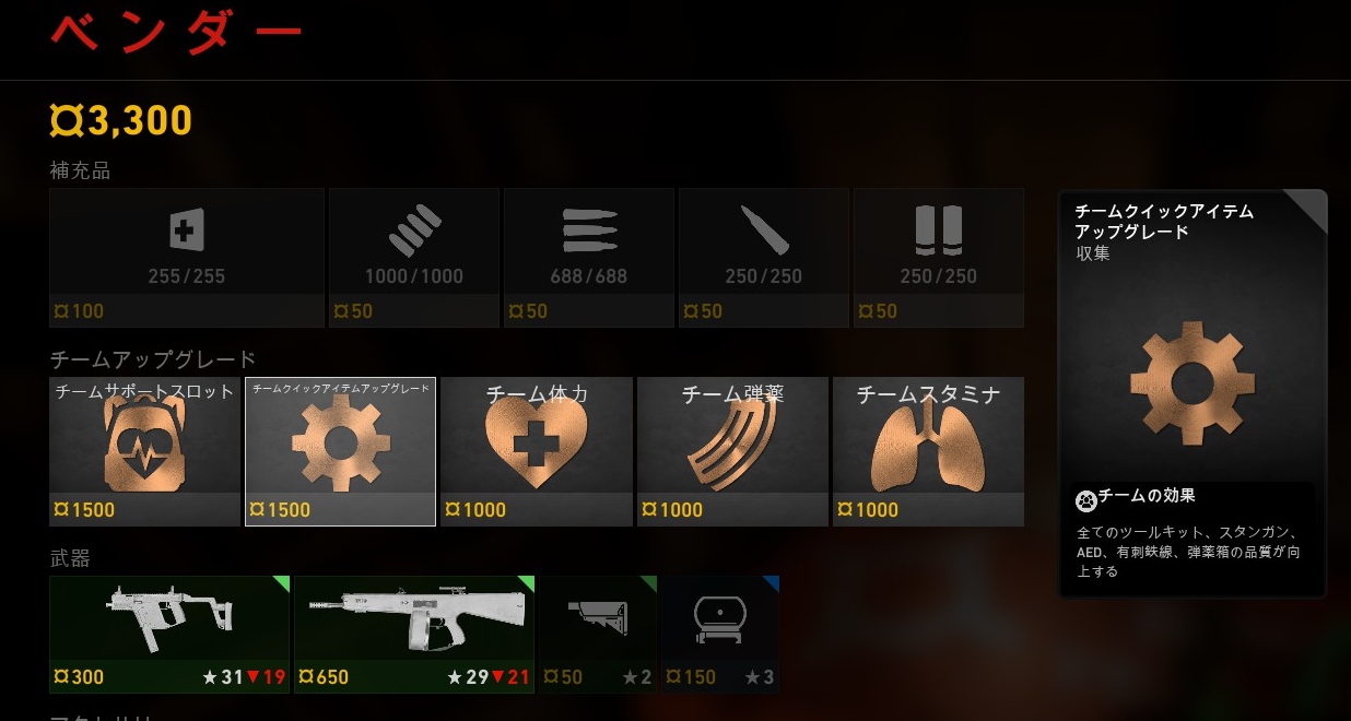 1,500となっている。品揃えは重複なしの2種類とチーム体力、チームスタミナ、チーム弾薬の5種類が販売される。