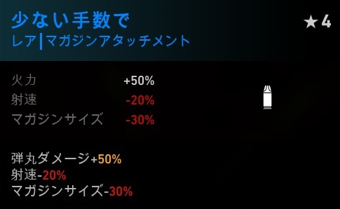 割合で強化されるため元々の威力が高い武器ほどダメージ上昇量も大きいが、マガジン弾数の低下によりただでさえ扱いづらい武器が余計に扱いにくくなってしまう可能性もある。
