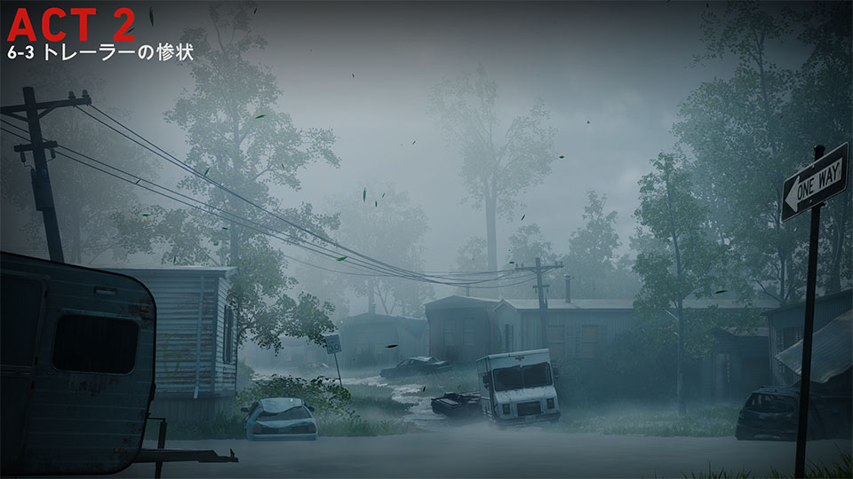 ほぼ全域が水浸しとなったこのエリアには複数のトレーラーハウスが並んでおり、中には物資が豊富においてある。医療キャビネットトレジャードアなどもこれらのどこかに配置されているため余裕があれば見て回りたいところだが、退廃カードでタイマー系のイベントカードが選択されている場合はある程度探索に見切りをつけて先に進むことも必要となる。ゲートから見て左奥に進んでいくとセーフルームがある。