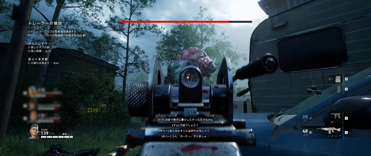 退廃カードで「ボス変異体」が選択されている場合、この駐車場内でボスが出現することがある。エリアが広く遮蔽物も多いため戦いやすくはあるが、セーフルームも近いので物資が乏しいなら無視することも1つの手。