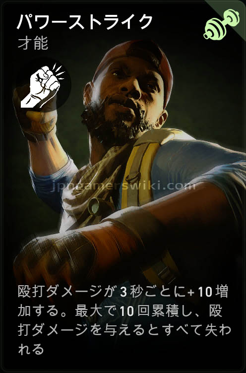 - 殴打ダメージが3秒ごとに+10増加する。最大で10回累積し、殴打ダメージを与えると全て失われる